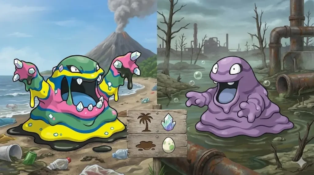 Tu explores les îles d’Alola et, au détour d’une ruelle, tu vois une flaque mouvante… mais pas vraiment violette.Plutôt verte, jaune, presque arc-en-ciel.Ce n’est pas